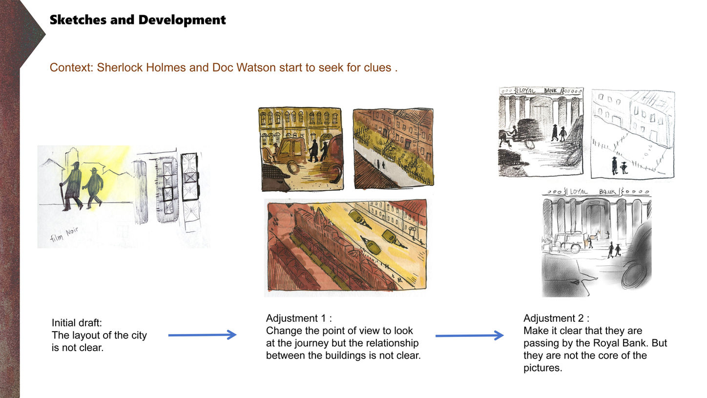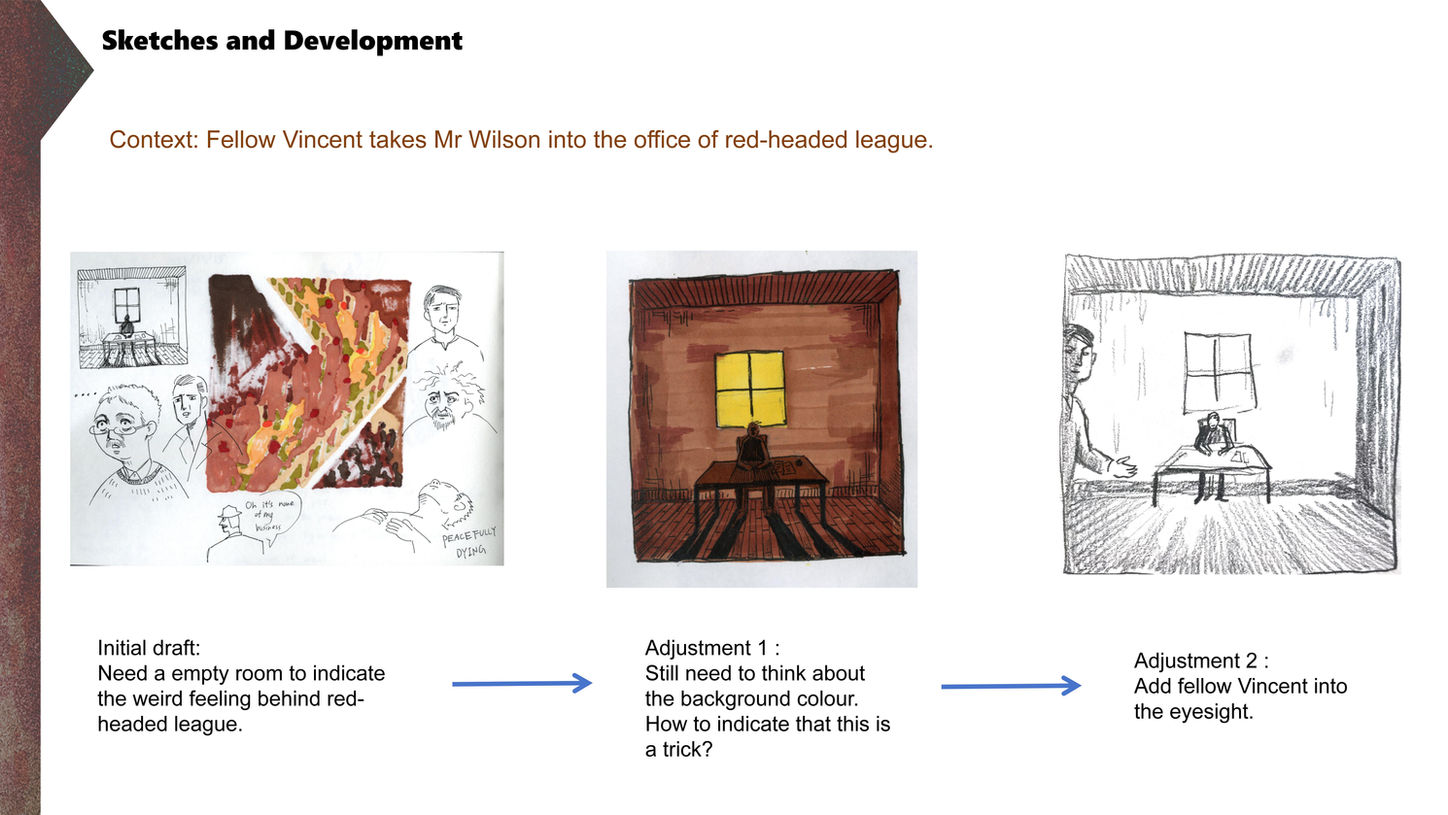 I read the story of the The Red-Headed League over and over again, designed the characters, and arranged the story structure and logic. If Holmes were really alive, I hope that after reading my illustrations, he could say, "This is exactly how I solved this case."